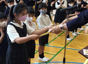全校朝礼時に、全日本書初め大展覧会の表彰がありました。 3名の児童が大きな賞をいただきました。学…