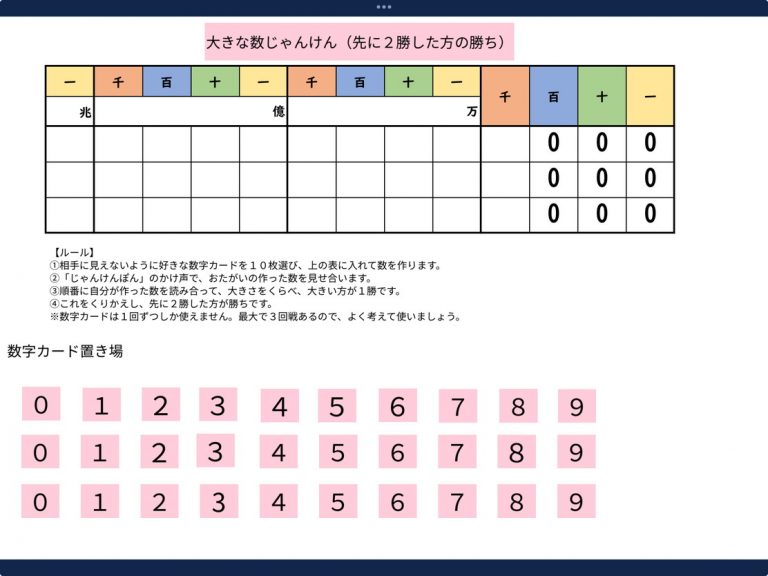 4年算数「一億をこえる数」の学習で「大きな数じゃんけん」を行いました。 まず、iPadに送られた0〜9が3枚…