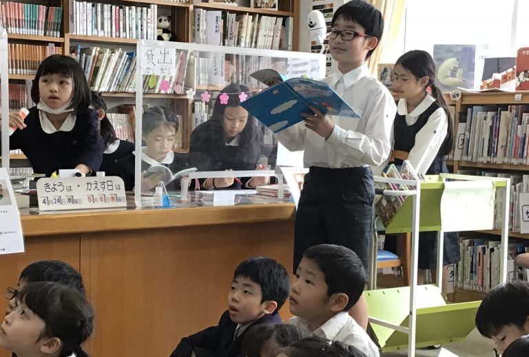 2024年4月24日(水)図書部の6年生が読み聞かせ会を開催しました。 画面を見ている下級生は絵本の世界に引…