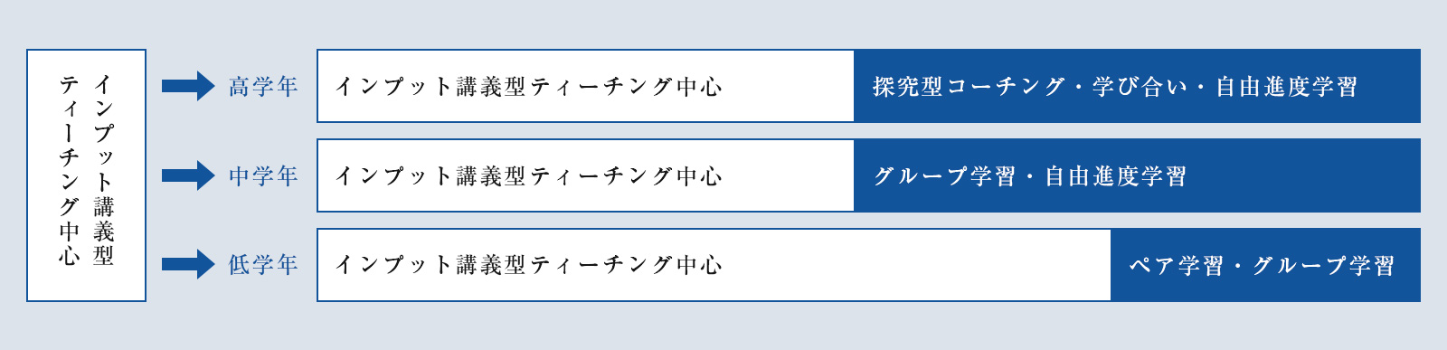 一般的な授業においては、今までのインプット講義型のティーチング中心から、児童主体の学びに変えていきます。もちろん小学生は、身につけなければいけない必須な基礎学力が多いので、しっかりと教えるインプットも欠かせませんので、生徒主体の協働的で、深い学びとのバランスをとりながら時間をかけて、理解と定着が深化するように学びます。