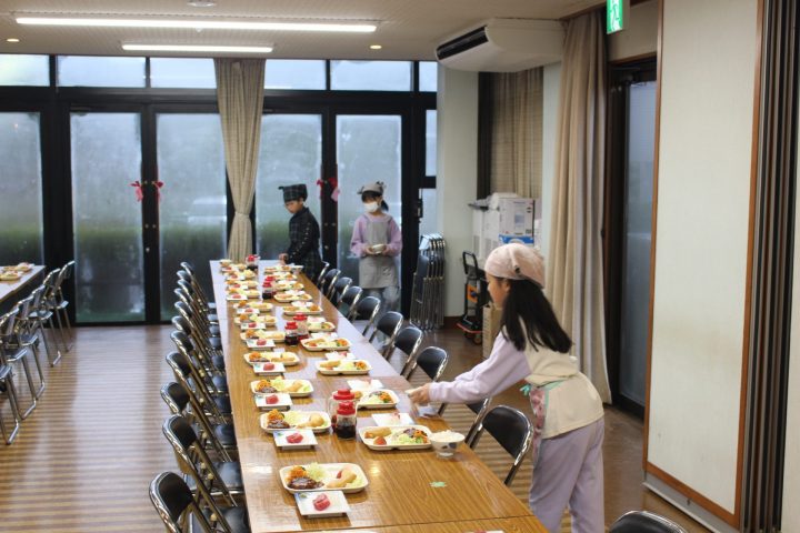 18時からは待ちに待った夕食です。食事当番の子がお手伝いをして準備をします。どの学年の児童もよく食べていました。