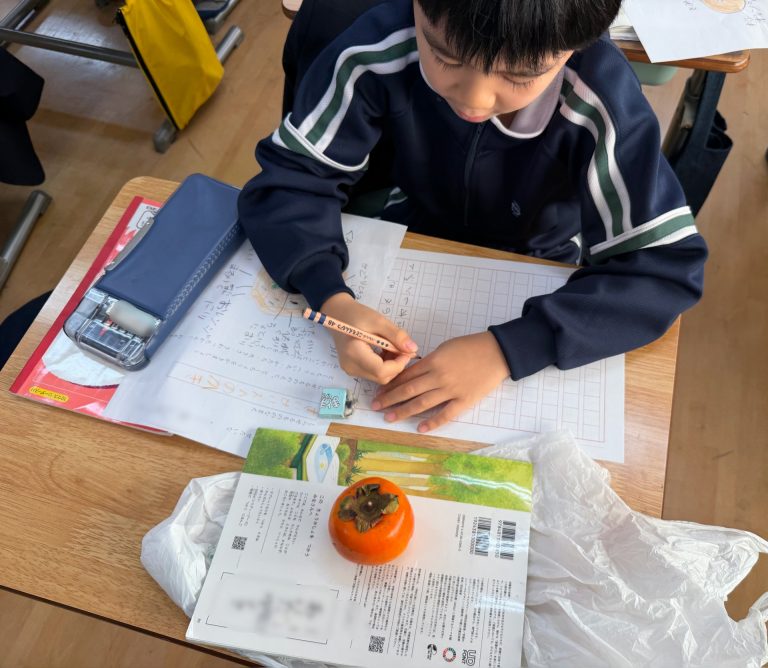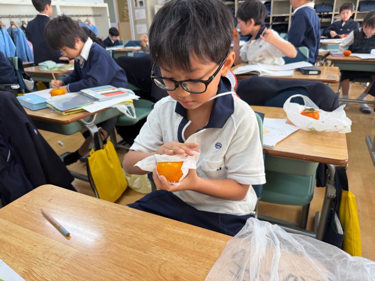 自然再生観察園で採ってきた柿が、教室に並びました。