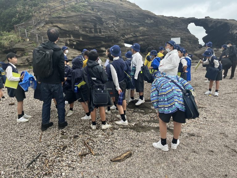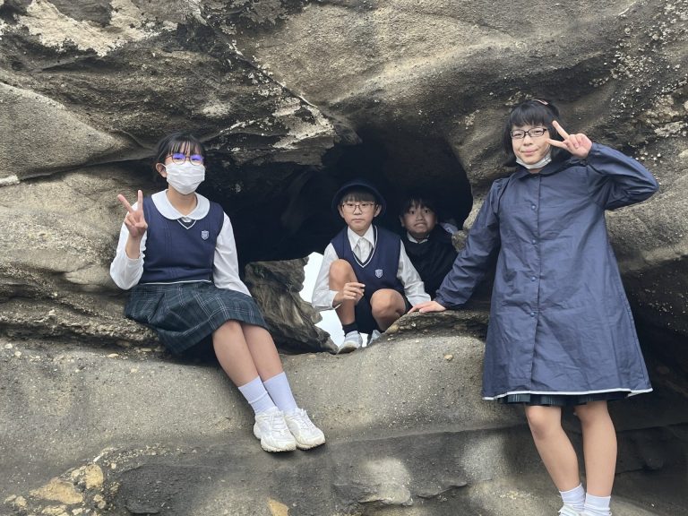 地層だけでなく、貝殻やカニなどに興味を持っている子も多く自然とも触れ合うことができました。昼食時には雨がやみ、城ヶ島公園で食べることができ児童もとてもうれしそうでした。