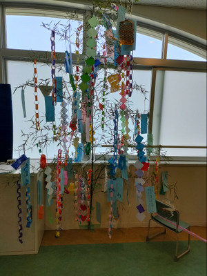 短冊に願いを込めて文章を書いたり飾りを作って飾ったりしました。