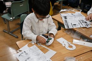 活動では、一人ひとりが工夫して金属探知機をデザイン・作成し、完成した探知機を使って教室の中を調査。「これは反応した!」「なんでこれは鳴らないの?」と、予想と結果の違いに驚きながら、素材の違いに興味を広げていきました。「10円玉は銅でできているから反応しないよ!」といった声も聞かれ、素材に関する理解が自然と深まっていく様子が印象的でした。