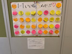 さらに、友だちのよいところを付箋に書いて本人に伝え、教室に貼り重ねる「いいねメッセージ」を実施し、教室の壁には温かい言葉が数えきれないほど並びました。