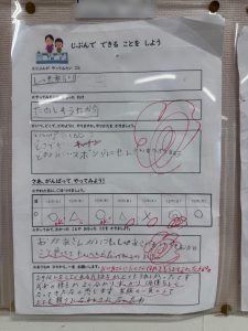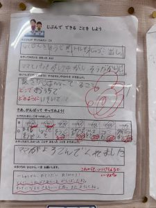 生活の授業では、自分のまわりのことをどれだけ自分でできているか、お家の人にどれだけ助けてもらっているかを書き出し、1週間の「お手伝いチャレンジ」に取り組みました。