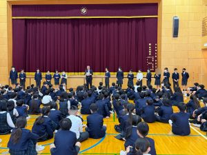 全校朝礼にて、なわとび大会の個人表彰を行いました。