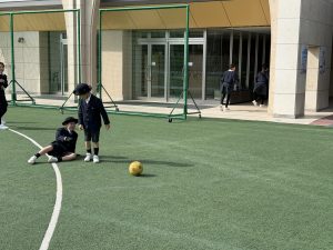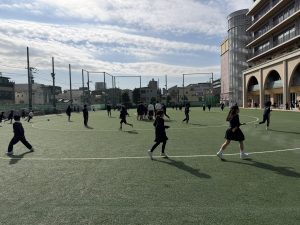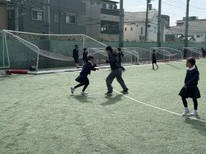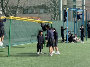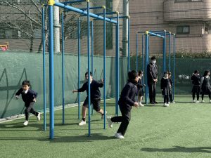冬の冷たい空気の中、子どもたちは次々と校庭に集まります。