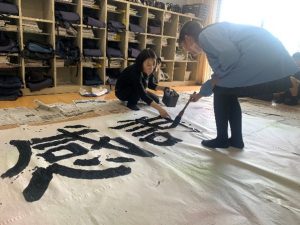昨日6年生は2年生から4年生までの間、書写を担当していただいていた小野寺先生と大きな紙を使い、一つの作品を制作しました。
