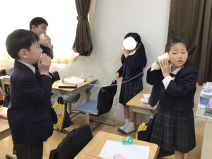 ペアのお友達と協力して、糸電話を作りました。
