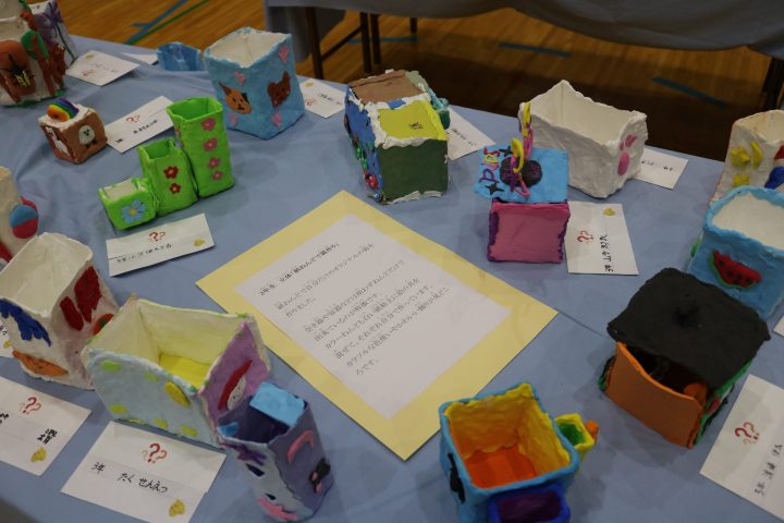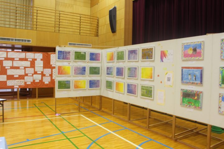 小学校では、体育館に図工、書写、家庭科や特別活動の授業の学習成果物を展示しました。