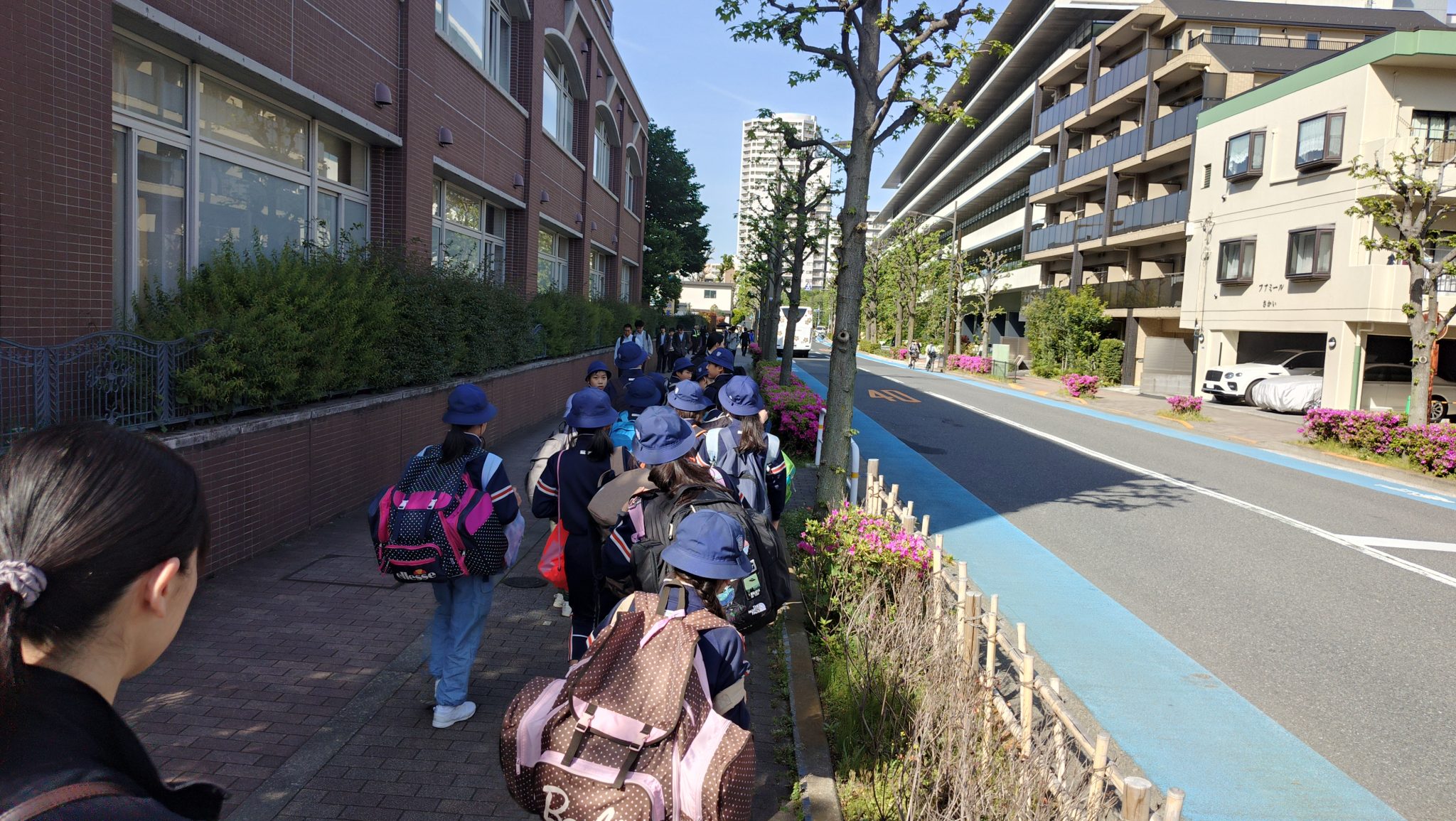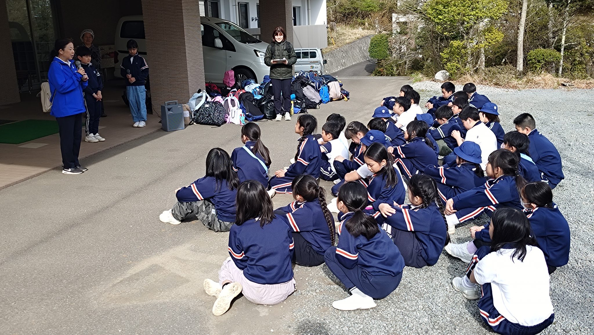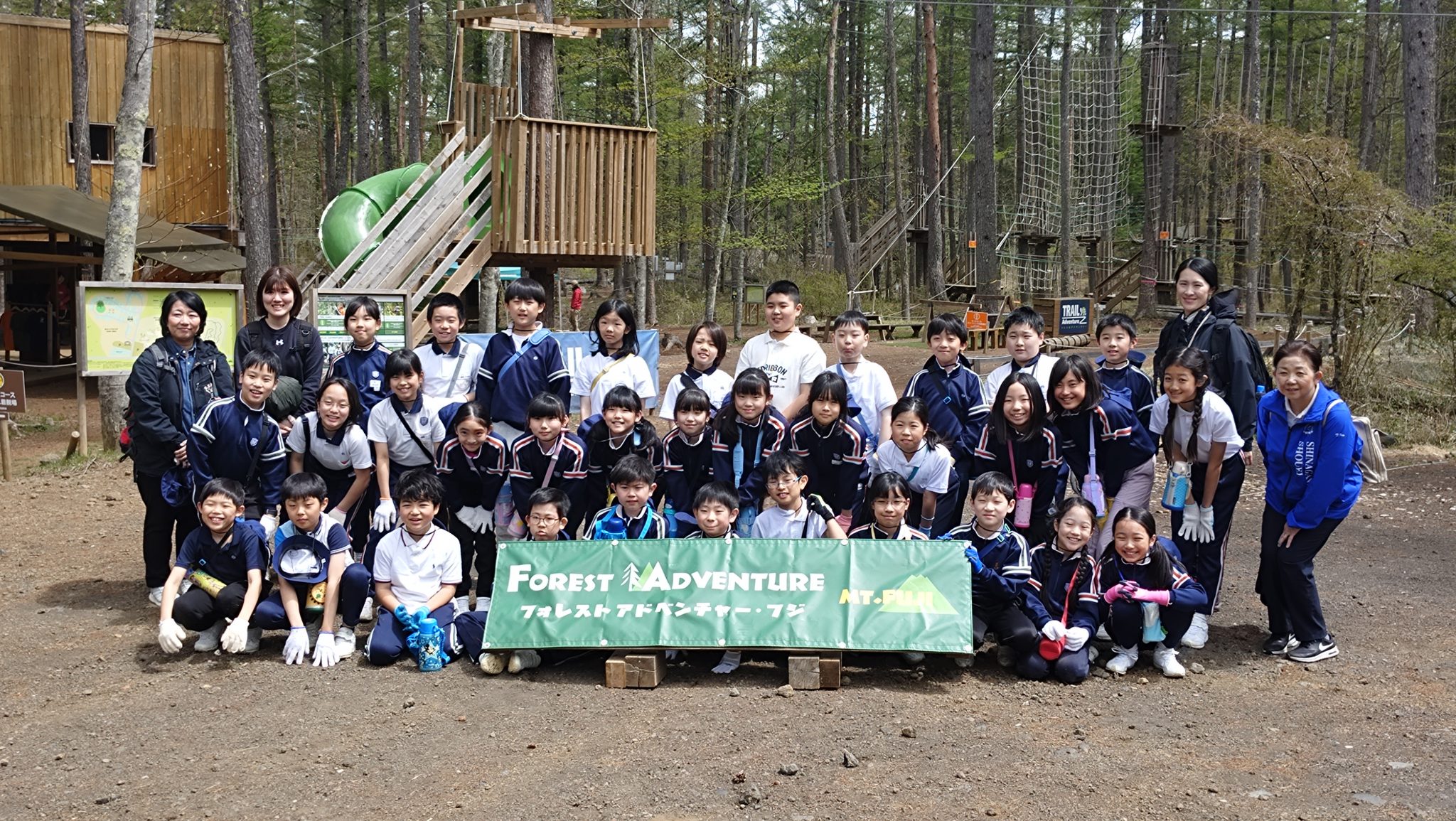 朝、大きな荷物を背負って、学校に集合した5年生は、保護者の皆様や先生方に見送られ、元気にバスで出発しました。道中は大きな渋滞もなく、予定どおりフォレストアドベンチャー・富士に到着しました。