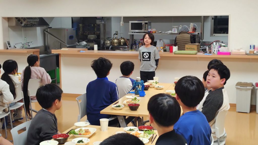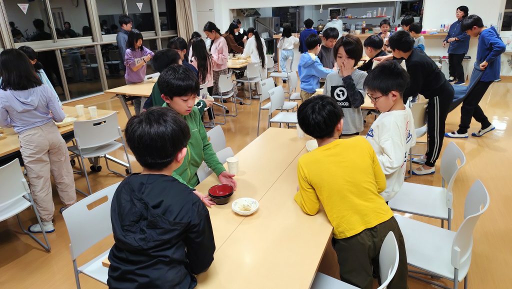 順番に入浴を済ませ、夕食の時間を迎えました。ここで活躍したのは食事係の子どもたちです。今日のメニューは、子どもたちの大好きな唐揚げ。しっかり体を動かした後でもあり、ご飯を何杯もおかわりする姿が多く見られました。食後は、自分たちで使った食器をきちんと片付けるところまで、一人ひとりがしっかり取り組んでいました。