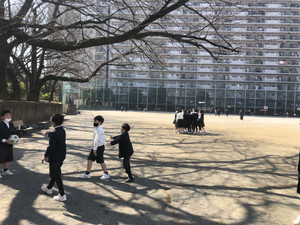 今年度は本校は新中央校舎建築工事のため校庭がありません。そこで子ども達が伸び伸びと遊ぶことが出来るようにと、学校近くの西大井公園へ昼休みに遊びに行きます。今日は気温も上がって気持ちのいい春の風を感じながらのびのびと遊ぶことが出来ました。