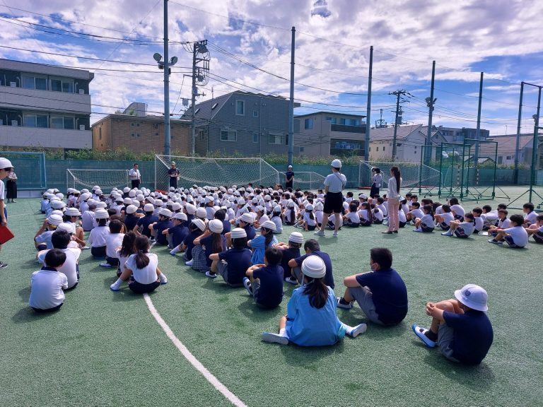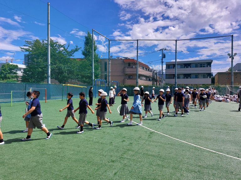 今回の避難訓練は、20分休み中に地震と火災が起こったことを想定して行いました。休み時間中ということで、教室にいるとは限りません。児童一人一人がどう行動したら自分の身を守れるかということを考えて取り組むことができました。