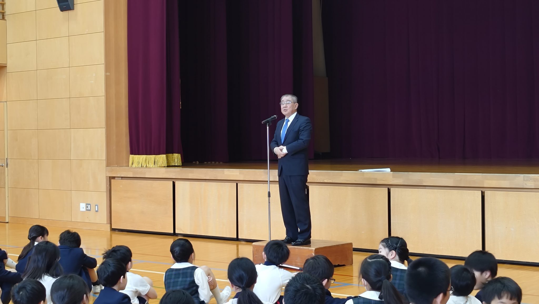 全校朝礼で、子どもたちが楽しみにしている校長講話が行われました。